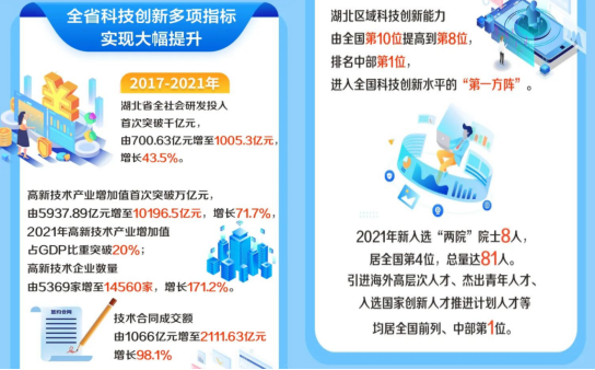 数据显示,湖北区域科技创新能力由全国第10位提高到第8位,排名中部第1位,进入全国科技创新水平“第一方阵”。