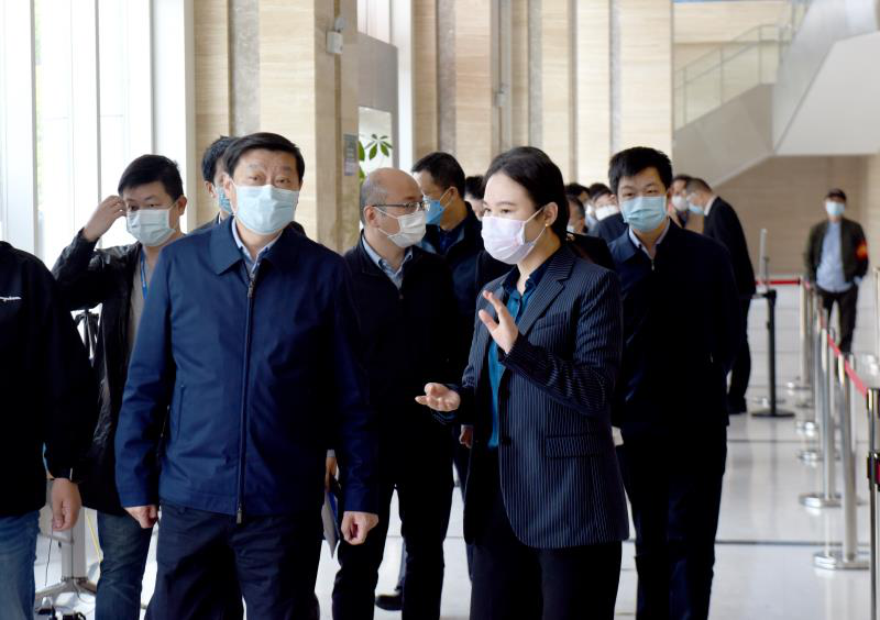 长投高科总经理易琳向东湖高新区党工委书记汪祥旺介绍光谷企业天地园区疫情防控、复工复产、园区运营情况