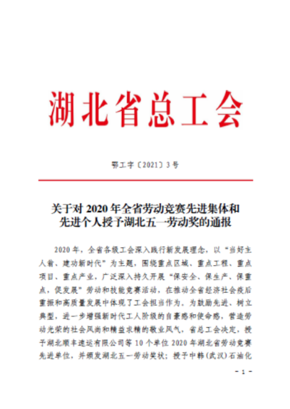 近日,湖北省总工会发布《关于对2020年全省劳动竞赛先进集体和先进个人授予湖北五一劳动奖的通报》,对全省10 个劳动竞赛先进单位、20 个先进个人、30 个先进班组进行了通报,获奖者将被同时授予湖北五一劳动奖状、湖北五一劳动奖章以及“湖北省工人先锋号”称号。长投集团广济药业武穴分公司广宁分厂发酵车间获2020年湖北省劳动竞赛先进班组暨“湖北省工人先锋号”荣誉称号。