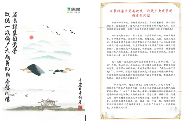 为深入学习贯彻习近平总书记关于加强和改进统一战线工作的重要思想,认真贯彻落实《中国共产党统一战线工作条例》,团结凝聚统一战线力量,引导广大统战成员为“一红一绿”新长投高质量发展砥砺奋进、主动作为,在2021年春节期间,集团党委开展统一战线“携手奋进新征程 同心建功‘十四五’”活动。