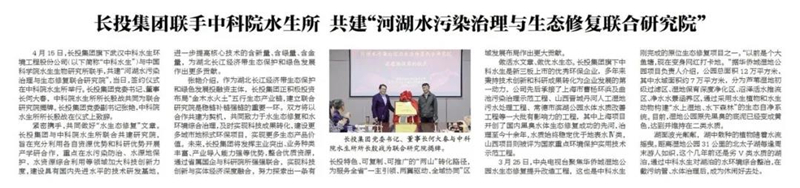 4 月15日,长投集团旗下武汉中科水生环境工程股份公司(以下简称“中科水生”)与中国科学院水生生物研究所联手,共建“河湖水污染治理与生态修复联合研究院”,当日,签约仪式在中科院水生所举行。长投集团党委书记、董事长何大春,中科院水生所所长殷战共同为联合研究院揭牌。长投集团党委副书记张艳,中科院水生所所长殷战在仪式上致辞。