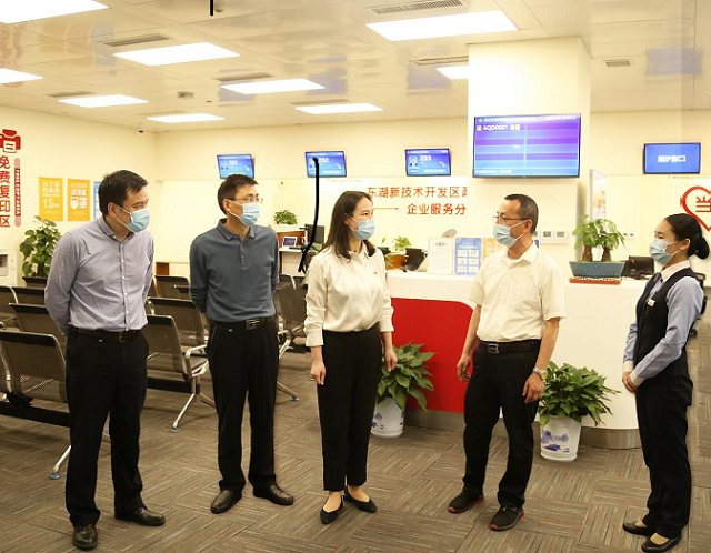 张良玉一行实地考察了光谷企业天地项目产业集聚情况,走访参观了园区光谷政务服务企业分中心、园区党建共建单位锦绣人才,并与长江科创服务集团班子围绕改革重组中进一步加强党的建设进行交流座谈。