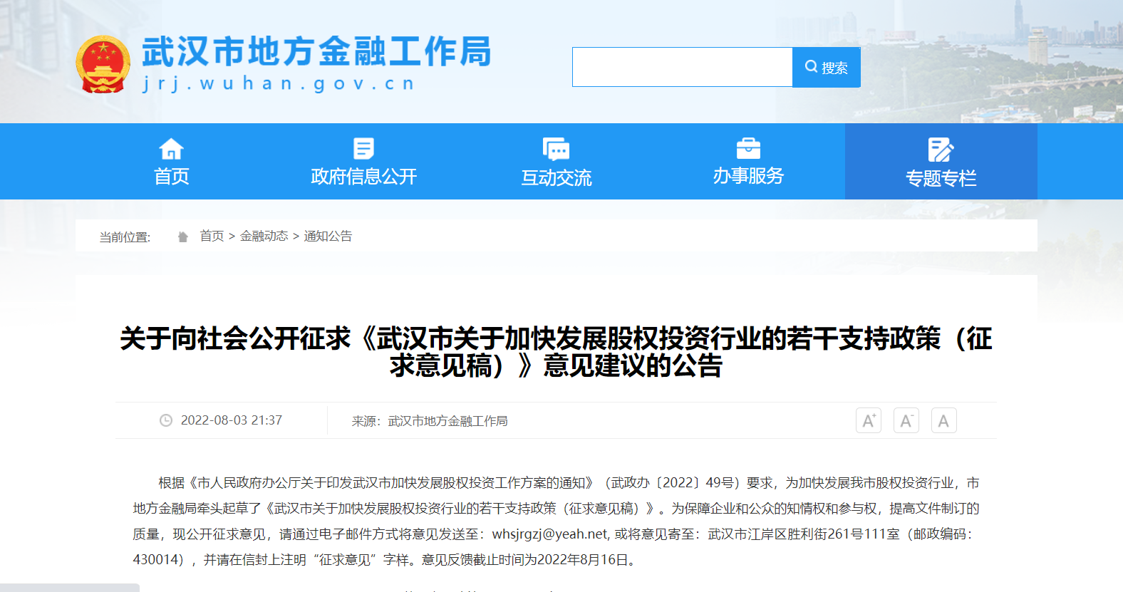 8月3日,武汉市地方金融工作局发布关于向社会公开征求《武汉市关于加快发展股权投资行业的若干支持政策(征求意见稿)》意见建议的公告。