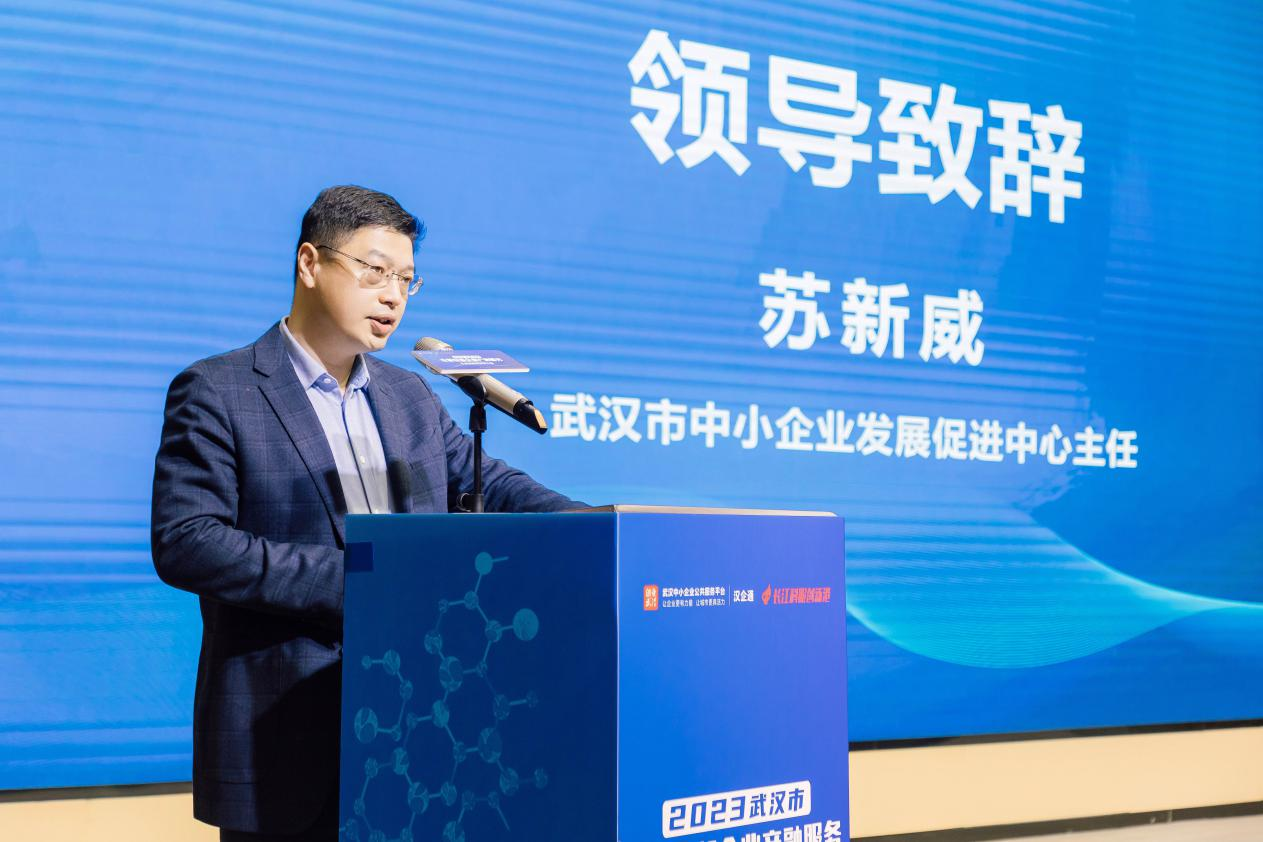 武汉市中小企业发展促进中心主任苏新威为活动致辞。他表示,本次生物医药产融专场通过项目和投融资机构的链接,为解决医药企业资金需求提供了平台和契机。