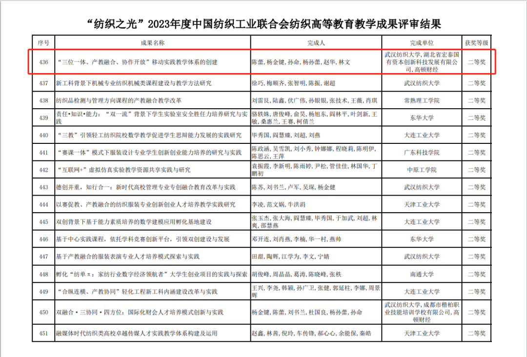 日前,由长江科服国创公司、武汉纺织大学、高顿财经团队联合主持的《产教融合、协作开放、移动实践教学》项目荣获“纺织之光”2023年度中国纺织工业联合会纺织高等教育教学成果二等奖。此奖项是我国纺织教育行业的最高奖项。