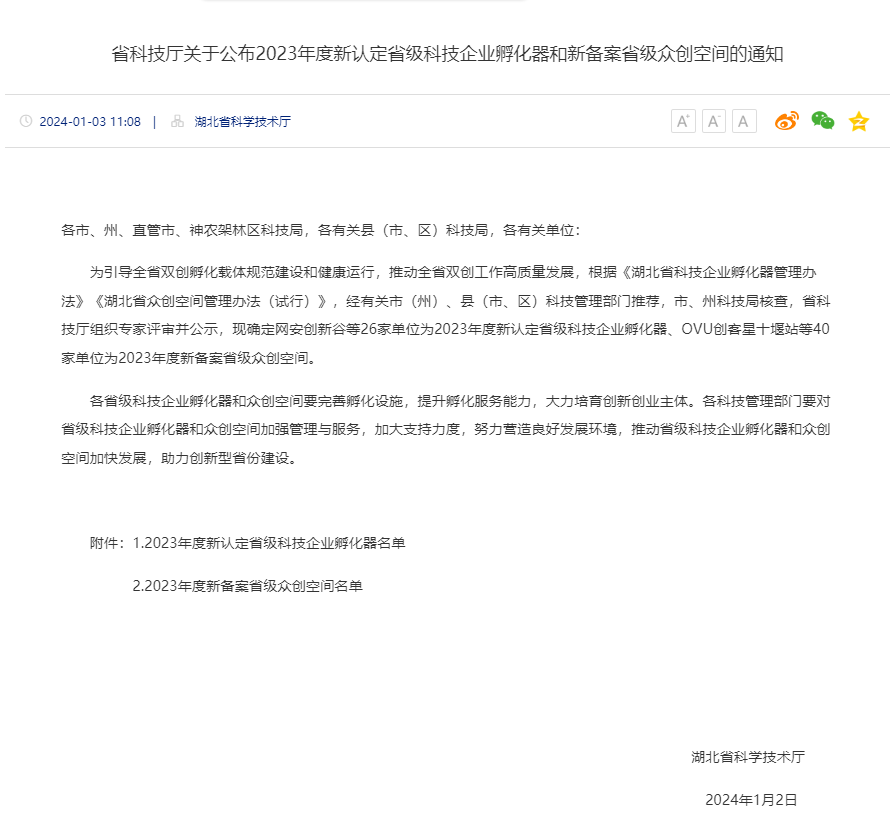 2024年1月2日,湖北省科学技术厅公示“关于2023年度省级科技企业孵化器和众创空间认定名单”,长江科服旗下华科公司运营的光谷企业天地孵化器荣获“湖北省科技企业孵化器”认定(公示)。
