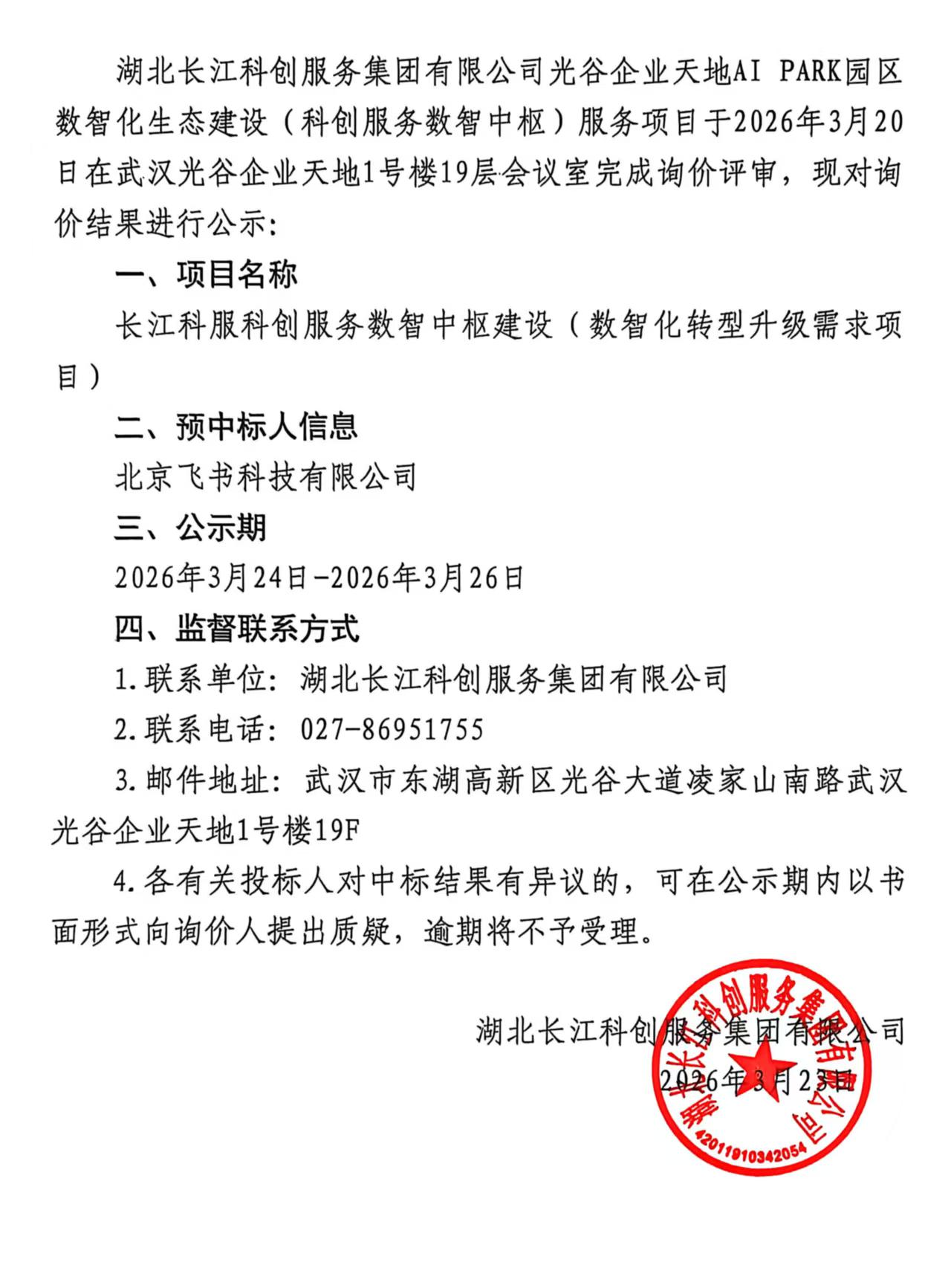 长江科服科创服务数智中枢建设(数智化转型 升级需求项目)询价结果公示